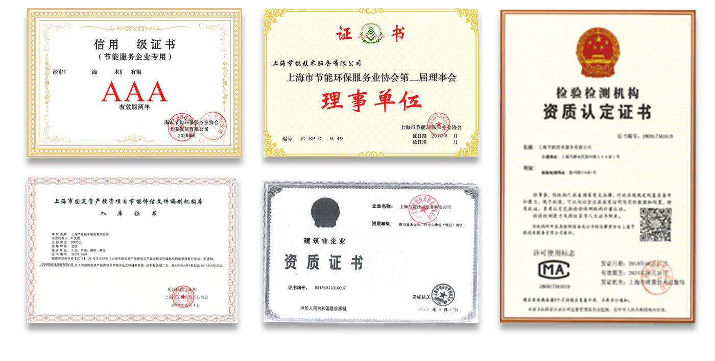 計(jì)量認(rèn)證證書(shū)、上海市固定資產(chǎn)投資項(xiàng)目節(jié)能評(píng)估文件編制機(jī)構(gòu)庫(kù)入庫(kù)證書(shū)、上海市節(jié)能服務(wù)機(jī)構(gòu)備案證書(shū)、上海市清潔生產(chǎn)審核機(jī)構(gòu)、信用等級(jí)證書(shū)(AAA)、上海市節(jié)能環(huán)保服務(wù)業(yè)協(xié)會(huì)理事單位